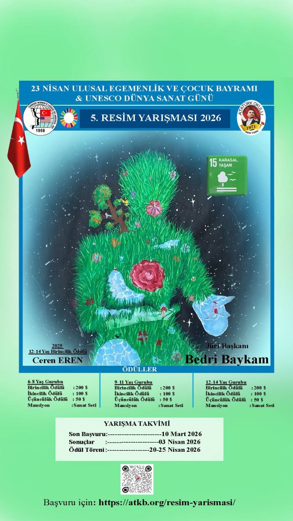 Türkiye Cumhuriyetin kurucusu Büyük Önder Gazi Mustafa Kemal Atatürk’ün tüm dünya çocuklarına armağan ettiği 23 Nisan Ulusal Egemenlik ve Çocuk Bayramı, geleceğe yönelik sorumluluklarımızı bir kez daha hatırlatmaktadır. Birleşmiş Milletler Küresel İletişim Departmanı (UNDGC) üyesi olan ve New York Atatürk Okulu’nun kurucusu Türk Amerikan Kadınlar Birliği (ATKB), UNESCO Dünya Sanat Günü’ne katkı sağlamak amacıyla “KARADA YAŞAM” temalı bir resim yarışması düzenlemektedir.